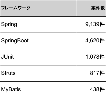 2026年2月時点のJavaフレームワーク別案件数では、1位がSpringで9,139件、2位がSpring Bootで4,620件、3位がJUnitで1,078件、4位がStrutsで817件、5位がMyBatisで438件です。