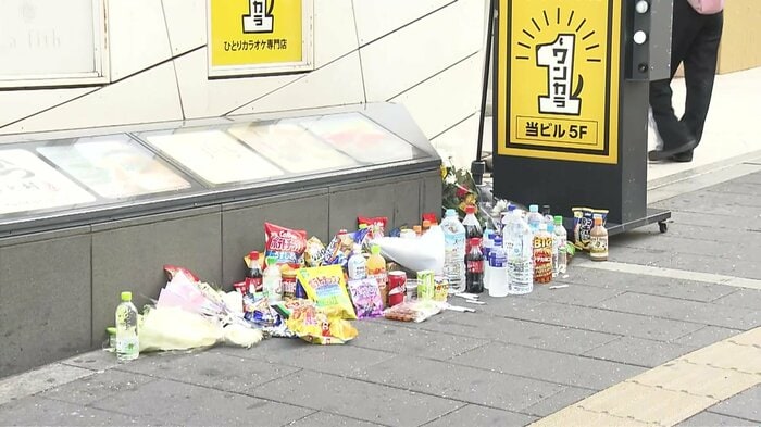 事件現場となったビルの前では、16日も多くのお菓子や飲み物が供えられていた。