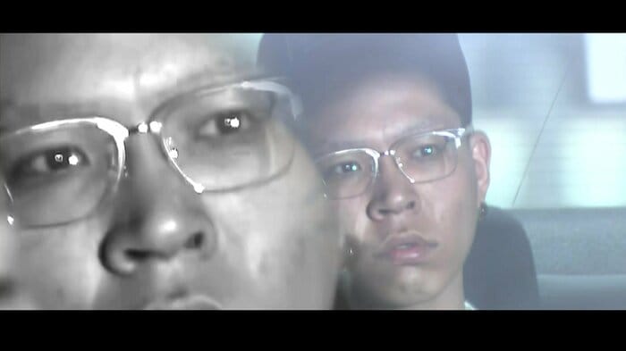 首をかしげながら、真っすぐ前を見る男。