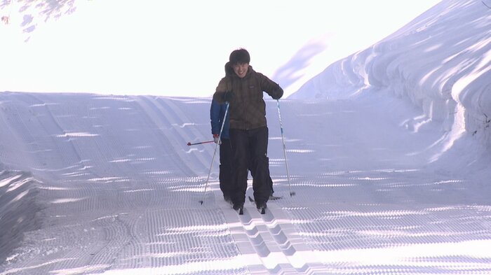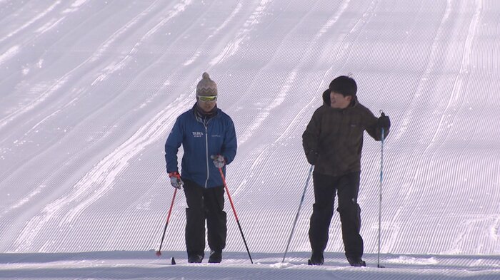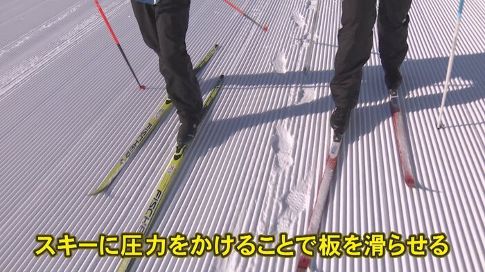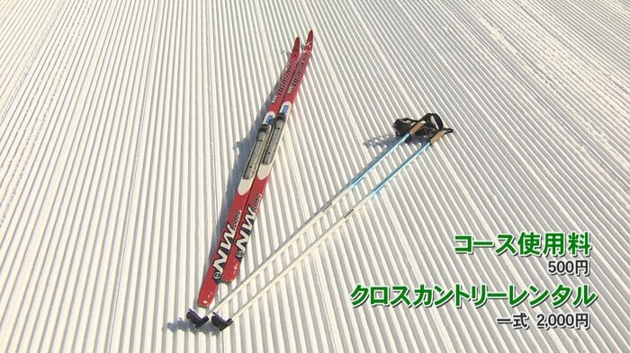 「この細くて長いスキー板とストックを使ってクロスカントリースキーを楽しむことができます。このスキー板、とっても軽いんです!」と菅谷アナウンサー。