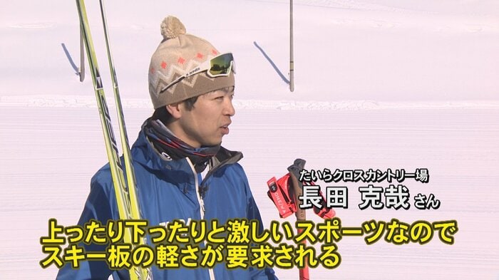 「このスキー板、とっても軽いですね」と菅谷アナに対し、インストラクターの長田さんは「上ったり下ったり、激しいスポーツなので、板の軽さが要求されるんです」と説明します。