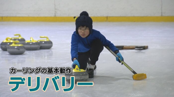 カーリング初挑戦の菅谷アナは、まずストーンを投げる基本動作「デリバリー」を教わりました。