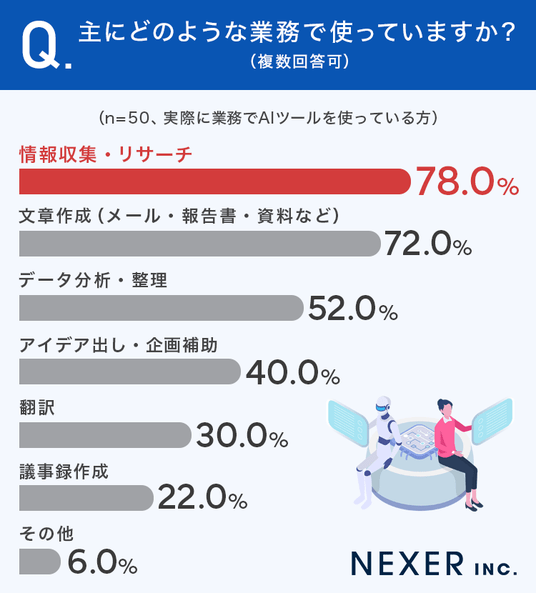 最も多かったのは「情報収集・リサーチ」で78.0%でした。次いで「文章作成(メール・報告書・資料など)」が72.0%、「データ分析・整理」が52.0%と続きます。