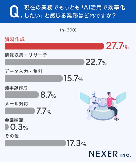 最も多かったのは「資料作成」で27.7%でした。続いて「情報収集・リサーチ」が22.7%、「データ入力・集計」が15.7%と続きます。