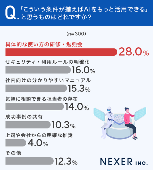 最も多かったのは「具体的な使い方の研修・勉強会」で28.0%でした。次いで「セキュリティ・利用ルールの明確化」が16.0%、「社内向けの分かりやすいマニュアル」が15.3%、「気軽に相談できる担当者の存在」が14.0%と続きます。