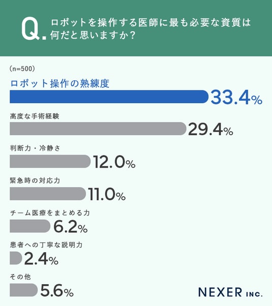 最も多かったのは「ロボット操作の熟練度」で33.4%、僅差で「高度な手術経験」が29.4%と続きました。そのほか「判断力・冷静さ」が12.0%、「緊急時の対応力」が11.0%、「チーム医療をまとめる力」が6.2%、「患者への丁寧な説明力」が2.4%、「その他」が5.6%という結果でした。