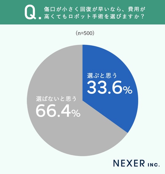 その結果「選ばないと思う」が66.4%、「選ぶと思う」が33.6%でした。約3人に2人が、費用面を理由にロボット手術を選ばないと回答しています。