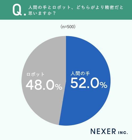 「人間の手」と回答した方が52.0%、「ロボット」と回答した方が48.0%という結果になりました。意見はほぼ半々に分かれましたが、わずかに人間の手を支持する声が多かったです。