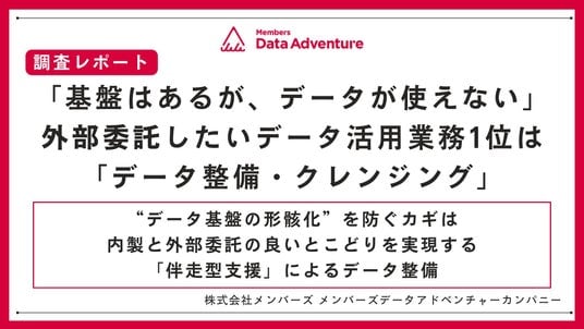 DX現場支援で顧客と共に社会変革をリードする株式会社メンバーズ(本社:東京都中央区、代表取締役社長:高野 明彦、東証プライム:2130、以下「メンバーズ」)のデータ領域プロフェッショナル常駐サービスを展開する専門組織、メンバーズデータアドベンチャーカンパニー(カンパニー社長:白井 恵里、以下「データアドベンチャー」)は、データ活用に関与するビジネスパーソン301名に対して、データ活用に関する調査を行いました。その結果、外部委託先に依頼しているデータ活用業務1位は「データ基盤の構築・導入(60.1%)」でした。対して外部委託先に支援を期待する業務の1位は「データの整備・クレンジング(41.9%)」でした。このことから、多くの企業でデータウェアハウス(以下:DWH)等のデータ基盤の構築は外部委託を活用し進んでいるものの、データの品質管理には手が回っておらず、外部委託のニーズが高いことがわかりました。