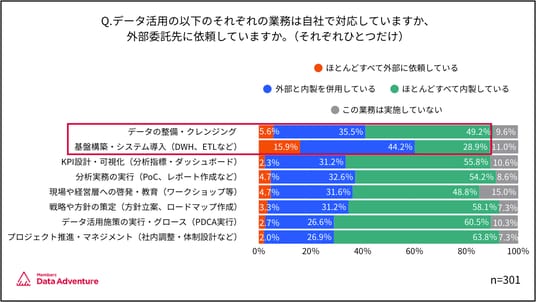 - 「データの整備・クレンジング」の方が併用・内製率が高く(外部委託内製併用:35.5%、内製:49.2%、合計:84.7%)、外部委託(5.6%)は「基盤構築・システム導入」の次に高いものの10%以上の開きがある