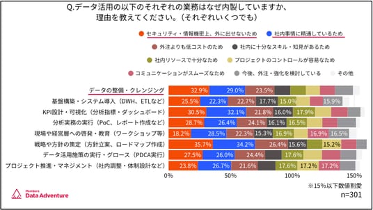 - データ活用業務ごとの内製理由を見ると、「セキュリティ・情報機密上、外に出せないため」と「(社員であれば)社内事情に精通しているため」が上位であった。「データの整備・クレンジング」では特にこの2点の割合が高く、外部委託のハードルになっていると考えられる