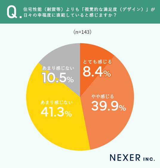 続いて、住宅性能(耐震等)よりも「視覚的な満足度(デザイン)」が日々の幸福度に直結していると感じるかを聞いてみました。