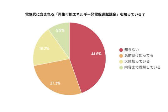 電気代の内訳に含まれる「再生可能エネルギー発電促進賦課金」について、「知らない」と回答した人は44.6%と最も多く、約半数にのぼりました。さらに、「名前だけ知っている」(27.3%)と回答した人を含めると、全体の約7割が内容を理解していないことが明らかになりました。