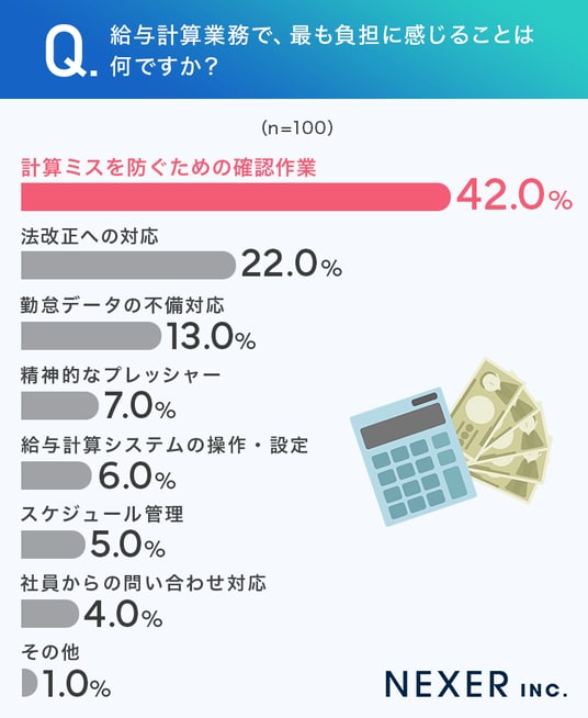 「計算ミスを防ぐための確認作業」が42%と最も多く、次いで「法改正への対応」が22%、「勤怠データの不備対応」が13%という結果でした。「精神的なプレッシャー」も7%あり、ミスが許されない業務からくる心理的負担も見逃せません。