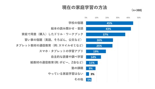 次いで、「絵本の読み聞かせ・音読(43%)」、「家庭で用意したドリル・ワークブック(37%)」と続き、家庭で取り入れやすい学習を日々の習慣としている様子がうかがえます。