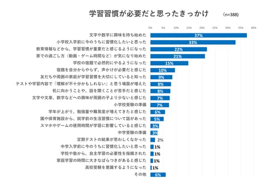 最も多かったのは、「文字や数字に興味を持ち始めた(37%)」でした。子ども自身の「知りたい」という興味関心の芽生えをきっかけに、学習習慣を意識し始めた家庭が多数です。