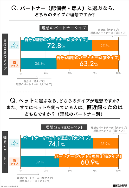 調査の結果「猫タイプ/犬タイプ」の自意識は男女ともに概ね50%ずつで、女性=猫っぽいなどのイメージは現実の自己認識とは一致しないことが判明。また約7割がパートナー・ペットにも同タイプを求める傾向も