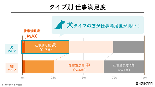 最後に、自分自身のキャラ自覚と仕事の価値観をクロス分析してみました。結果「やっぱり・・」と少し微笑ましい差分が出たのが、「犬タイプの人の方が夢中で働く割合(=仕事満足度)が高い」という点です。「猫の手も借りたい」という慣用句もありますが、実際に人間の仕事を手伝うのは犬ばかり。このあたり犬や猫自身はどう思っているのか、いつか実際に犬や猫の皆様にもアンケートを実施してみたいところです。