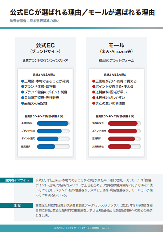 本資料では、価格依存が進む現在のEC市場を背景に、モールECと自社ECの最適な役割分担と、モールECと自社ECに対して消費者が求めているポイントを徹底解説。