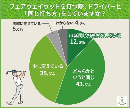 「ほぼ同じ打ち方をしている(12.0%)」「どちらかというと同じ(43.5%)」を合わせると、55.5%と過半数のアマチュアゴルファーがフェアウェイウッドを打つ際に、ドライバーとほぼ同じ感覚で振っていることが明らかになりました。