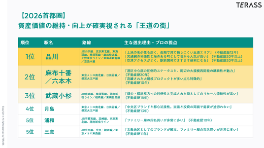 長引く住宅価格の高騰を受け、単なる「住み心地」だけでなく、将来売却することを前提とした「出口戦略(リセールバリュー)」重視の購入が一般的となっています。一方で、どのようなエリア・物件であれば「資産性」が期待できるのかは、一般の生活者では見極めが難しく、信頼できる「不動産のプロ」からのアドバイスが必要です。こうした背景を受け、このたびTERASSは、住宅購入を検討するお客さまの参考になる「プロの情報」を提供すべく、TERASSに所属するプロフェッショナルな不動産エージェント、およびTERASS以外の不動産事業者で働く「不動産のプロ」合計100名の視点から、2026年に注目すべきエリアを「王道」「穴場」「予算8,000万円以下」の3つの切り口で選出いたしました。
