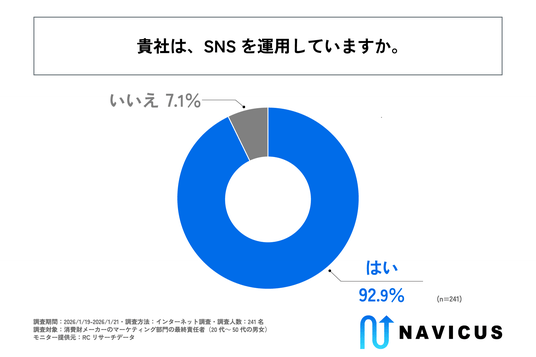 まず、「所属企業では、SNSを運用しているか」を尋ねる設問への回答では、「はい」が92.9%、「いいえ」が7.1%という結果になりました。この結果から、消費財メーカーの9割以上が、SNSを運用していることがわかりました。
