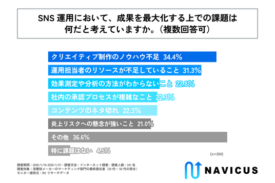 調査の最後、自社でSNSを運用していると回答した人を対象に「SNS運用において、成果を最大化する上での課題は何だと考えているか」を尋ねる設問への回答では、1位が「クリエイティブ制作のノウハウ不足」で34.4%、2位が「運用担当者のリソースが不足していること」で31.3%、3位が「効果測定や分析の方法がわからないこと」で22.8%という結果になりました。この結果から、SNS運用において、成果を最大化する上での主な課題は「クリエイティブ制作のノウハウ不足」や「運用担当者のリソース不足」であることが明らかになりました。