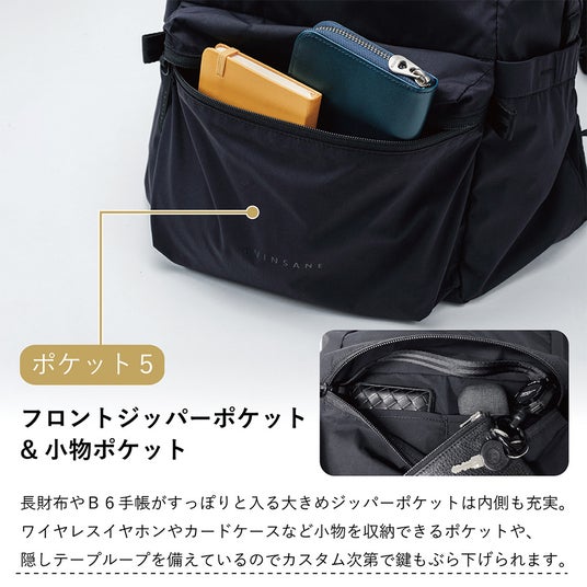 ・長財布や手帳も収まる大ぶりフロントポケット