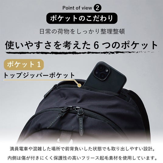 ・ガジェットを守る起毛素材のトップポケット