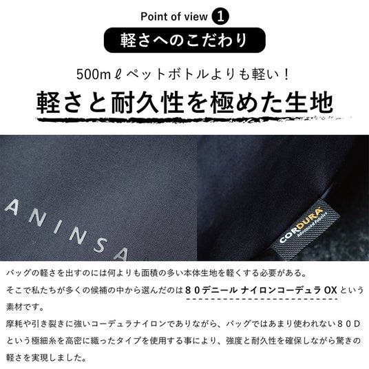 採用したのは、極薄80デニールのCORDURA(R)ナイロンに撥水加工を施した独自素材。
