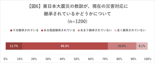 - 東日本大震災の教訓が現在の災害対応に継承されているかどうかについて、「継承されている」と考える人は71.9%(863人)だった。反対に、「継承されていない」と考える人は28.1%(337人)と、4人に1人以上が回答した【図6】。継承されていないと考える人の理由は、「災害が起きるたびに似たような問題提起がされるから」が35.0%(118人)で最多。順に、「メディアで扱われる機会が減ったから」が31.5%(106人)、「日常生活に戻って振り返る機会が減ったから」が28.2%(95人)などと続いた【図7】。