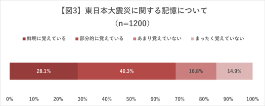 - 東日本大震災に関する現在の記憶について尋ねると、「部分的に覚えている」と回答したのが40.3%(483人)で最多。以下順に、「鮮明に覚えている」が28.1%(337人)、「あまり覚えていない」が16.8%(201人)、「まったく覚えていない」が14.9%(179人)という結果であった【図3】。