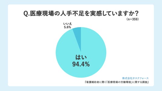 「医療現場の人手不足を実感していますか?」(n=359)と質問したところ、「はい」が339人(94.4%)、「いいえ」が20人(5.6%)でした。9割超の看護補助者が、医療現場の人手不足を実感していることが分かりました。