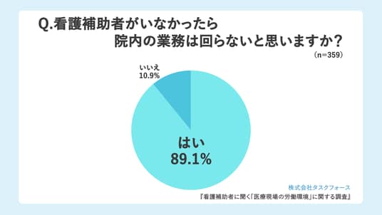 「看護補助者がいなかったら院内の業務は回らないと思いますか?」(n=359)と質問したところ、「はい」が320人(89.1%)、「いいえ」が39人(10.9%)でした。9割の看護補助者が、看護補助者なしでは院内業務は回らないと実感していることが分かりました。