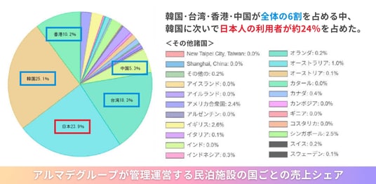 当グループの株式会社アンドエスが運営する物件の実績データによると、宿泊者の国別割合において「日本人」が約24%と、全体の約4分の1を占めています。