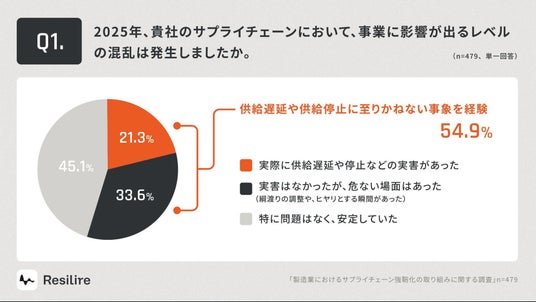 2025年、製造業のサプライチェーンにおいて、事業に影響が出るレベルの混乱を経験した企業は54.9%に上りました。内訳を見ると、実際に供給遅延や停止などの実害があった企業は21.3%。さらに、実害は免れたものの「綱渡りの調整やヒヤリとする瞬間があった」と回答した企業も33.6%に上ります。