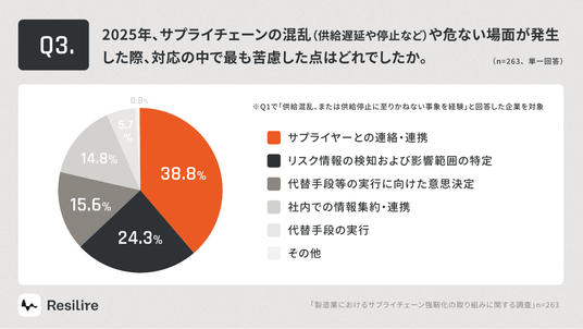 サプライチェーンの混乱時の対応において最も苦慮した点として、多く挙げられたのは「サプライヤーとの連絡・連携(38.8%)」、次いで「リスク情報の検知および影響範囲の特定(24.3%)」となりました。