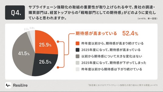 株式会社Resilire(本社:東京都港区、代表取締役CEO:津田 裕大、以下「当社」)は、従業員500名以上の製造業における役員および管理職層を対象に、「製造業におけるサプライチェーン強靭化の取り組みに関する調査」を実施いたしました。