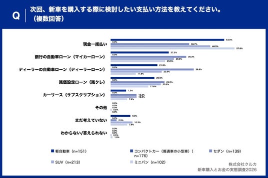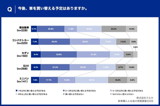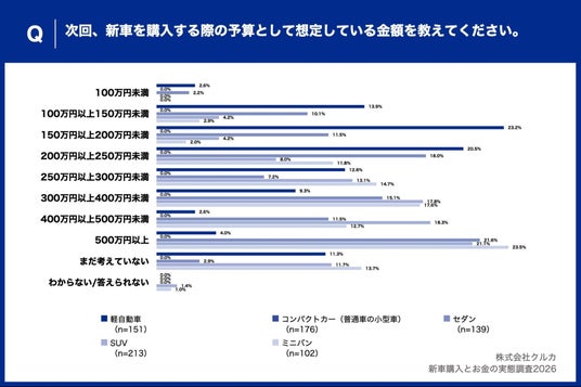 株式会社クルカは、直近3年以内に新車を購入し、購入時の意思決定に関与した方 1,076名を対象に、新車購入とお金の実態調査2026を実施しましたので、お知らせいたします。本リリースでは、車のカテゴリ別に見た「買い替え予定のある人は、次回の予算と支払いをどう変えるか」を分析した結果をお知らせいたします。