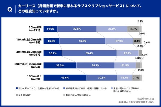 まず、カーリース(月額定額で新車に乗れるサブスクリプションサービス)について、どの程度知っているかという質問では、1回あたりの平均走行距離が長くなるほど「詳しく知っており、仕組みも理解している」の割合が高くなる傾向が顕著に表れました。1回あたりの平均走行距離が100km以上の層では43.6%が「詳しく知っている」と回答し、10km未満の層の14.0%を29.6ポイント上回る結果となっています。