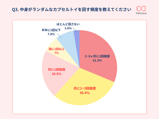 一方で「ほとんど回さない」という回答はわずか「2.6%」に留まっており、新商品の発売サイクルに合わせた定期的な「カプセルトイ回し」が習慣化している実態が伺えます。