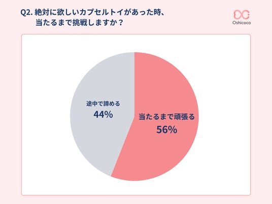「絶対に欲しい景品があった時、当たるまで挑戦するか」という問いに対し、半数を超える「56%」が「当たるまで頑張る」と回答しました。