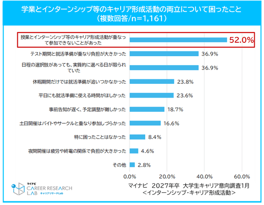 1月にインターンシップ等のキャリア形成活動に参加した学生の割合は49.4%で、前月より11.0pt減少となった。学業とインターンシップ等のキャリア形成活動の両立はどの程度大変かを聞いたところ、79.8%が「大変(とても大変+やや大変)」だと回答した。また、学業とインターンシップ等のキャリア形成活動の両立について困ったことを聞くと、「授業とインターンシップ等のキャリア形成活動が重なって参加できないことがあった(52.0%)」が最多であった。学生の授業スケジュールと企業側のインターンシップ等のプログラム日程が重なってしまい、両立が困難となっていることがうかがえる。【図4、5、6】