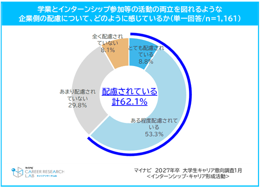 学業とインターンシップ参加等のキャリア形成活動の両立について、企業側の配慮をどのように感じているか学生に聞いたところ、62.1%が「配慮されている(とても配慮されている+ある程度配慮されている)」と回答した。昨今では学業への配慮のため、プログラム実施について工夫を凝らす企業も多く、過半数の学生がそうした企業側の対応を肯定的に捉えているようだ。