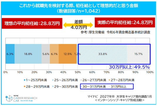 ◆27年卒学生の「理想の初任給」は平均28.8万円。大卒初任給平均額24.8万円と約4万円の差。30万円以上の回答も49.5%