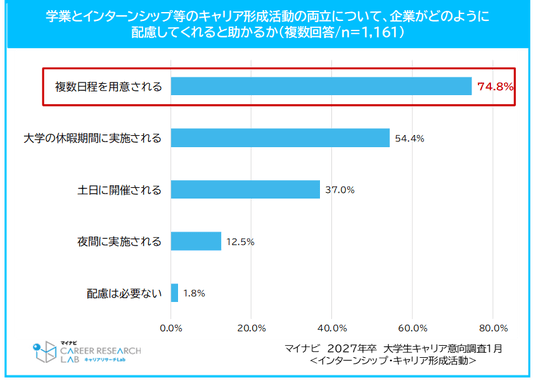 ◆62.1%の学生が、学業とキャリア形成活動の両立に対して企業から「配慮されている」と回答。企業に求める配慮として「複数日程を用意される」ことが74.8%