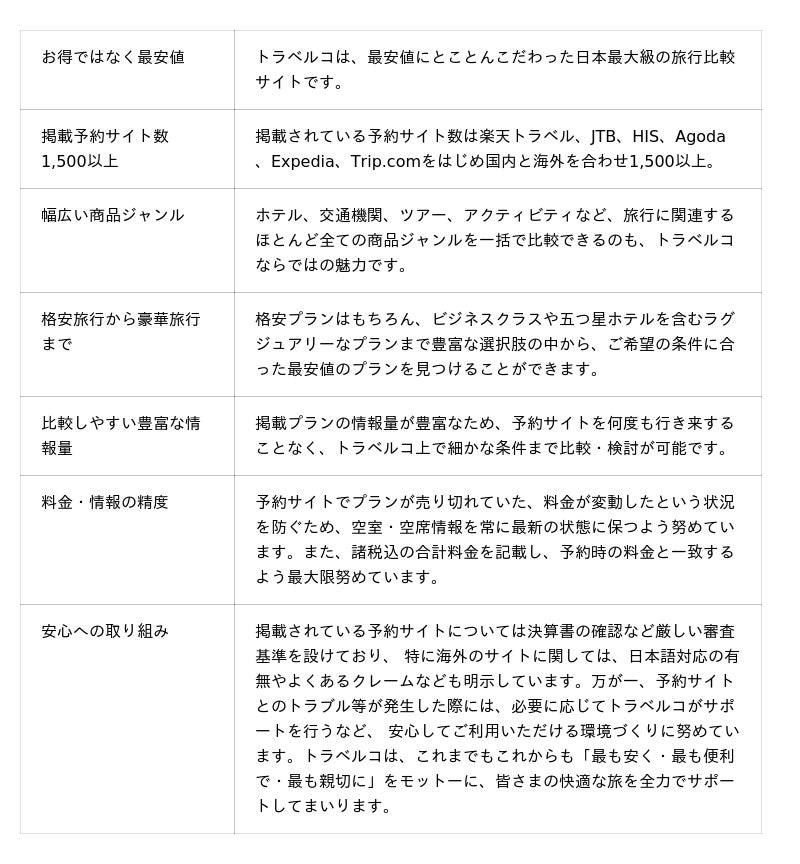 トラベルコは、これまでもこれからも「最も安く・最も便利で・最も親切に」をモットーに、皆さまの快適な旅を全力でサポートしてまいります。