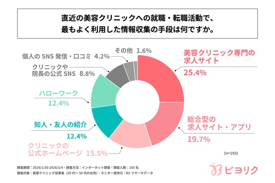 また、美容クリニック従事者を対象に「直近の美容クリニックへの就職・転職活動で、最もよく利用した情報収集の手段は何か」を尋ねる設問への回答では、1位が「美容クリニック専門の求人サイト」で25.4%、2位が「総合型の求人サイト・アプリ」で19.7%、3位が「クリニックの公式ホームページ」で15.5%という結果になりました。この結果から、直近の美容クリニックへの就職・転職活動において、最もよく利用した情報収集の手段は「美容クリニック専門の求人サイト」であることがわかりました。