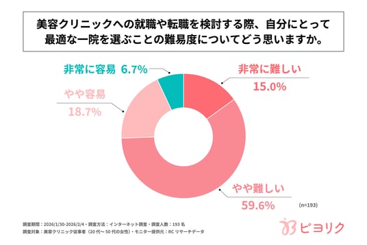次に、美容クリニック従事者を対象に「美容クリニックへの就職や転職を検討する際、自分にとって最適な一院を選ぶことの難易度についてどう思うか」を尋ねる設問への回答では、1位が「やや難しい」で59.6%、2位が「やや容易」で18.7%、3位が「非常に難しい」で15.0%という結果になりました。1位と3位の各回答の比率を合計すると74.6%となり、この結果から、美容クリニック従事者の7割以上が、美容クリニックへの就職や転職を検討する際、自分にとって最適な一院を選ぶことを、程度の差こそあれ、難しいと感じていることが判明しました。