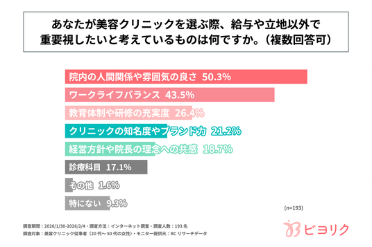 続いて、美容クリニック従事者を対象に「自身が勤務する美容クリニックを選ぶ際、給与や立地以外で重要視したいと考えているものは何か」を尋ねる設問への回答では、1位が「院内の人間関係や雰囲気の良さ」で50.3%、2位が「ワークライフバランス」で43.5%、3位が「教育体制や研修の充実度」で26.4%という結果になりました。この結果から、美容クリニックを選ぶ際に給与や立地以外で重要視する主な点は、「院内の人間関係や雰囲気の良さ」や「ワークライフバランス」であることが明らかになりました。